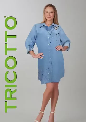 Premium knit shirt dress with sequin front detail. Crystal detail on front only, back is solid blue.