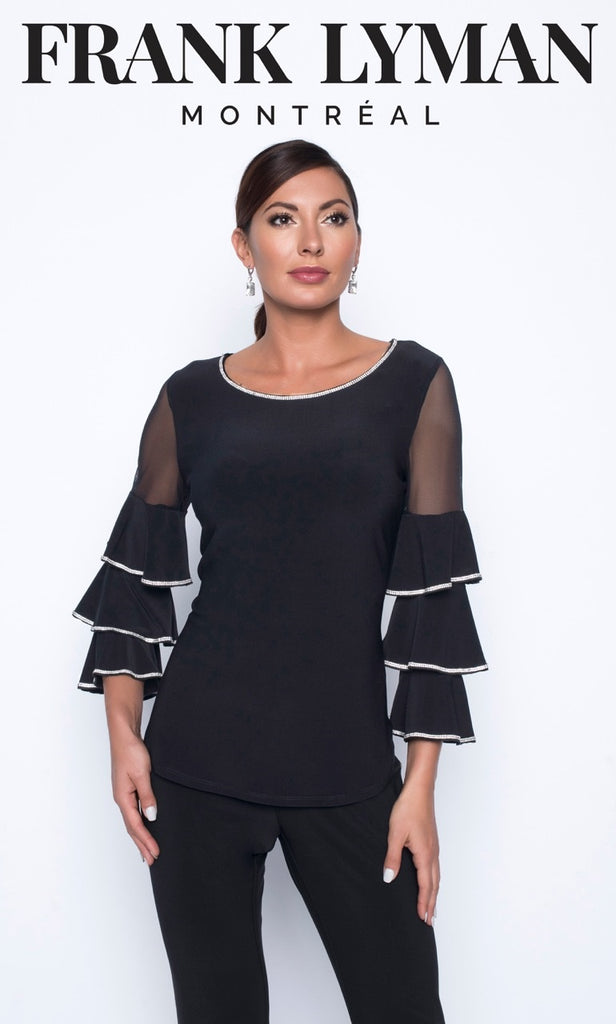 Elegant evening top with tiered sheer ruffled sleeve and diamonte embellished edges. Flattering silhouette with rounded neckline, great to wear with pant 082, 006. Hand wash cold water, 96% polyester, 4% elasthane. Embellished on front & back. Unlined and approx. 28 inches long with 21 inch sleeves. Sized 4-22. MSF.